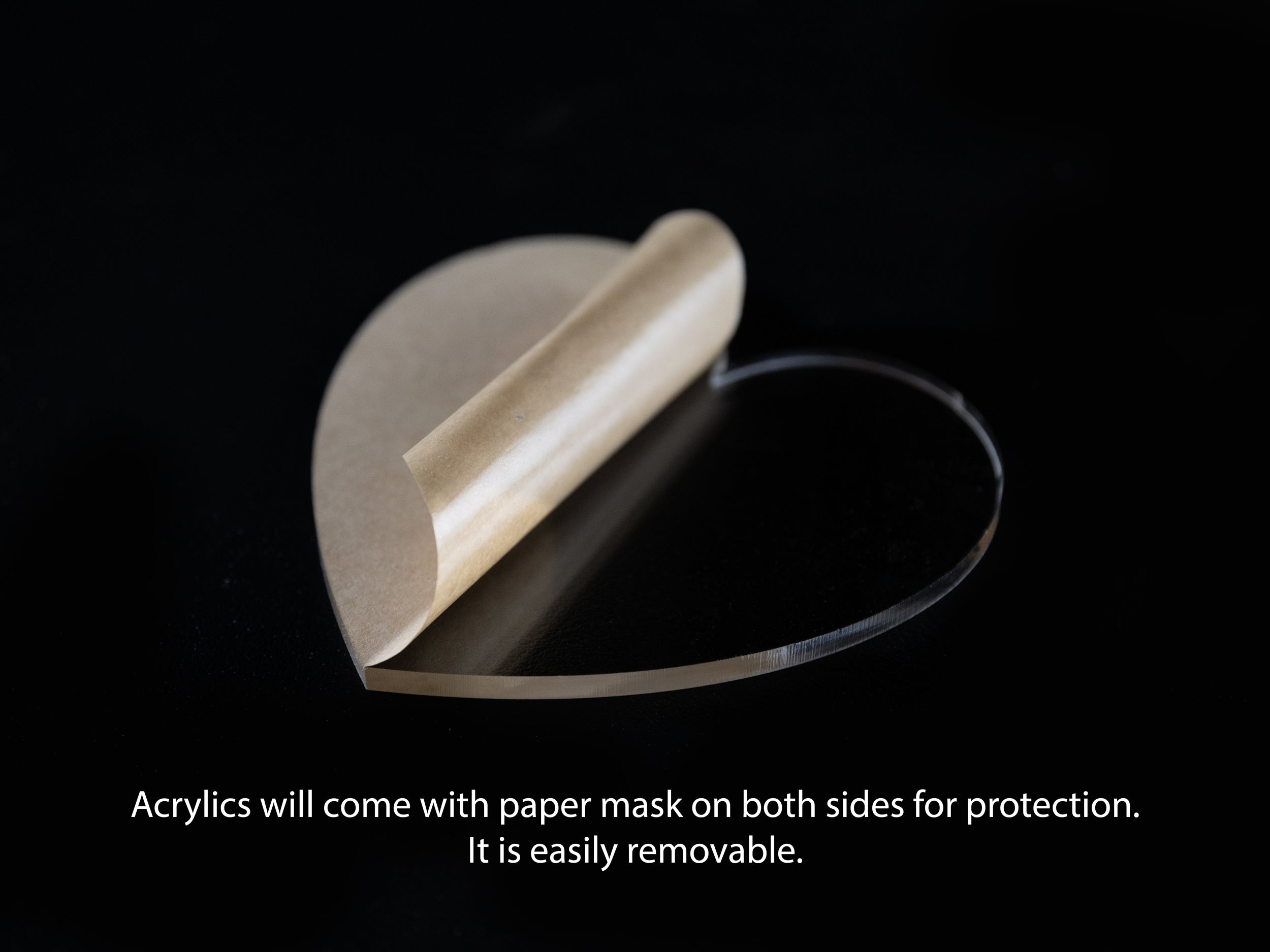 We offer high quality clear cast acrylic shape cutouts.  All acrylic is high grade. Crystal clear; transmits 92% of visible light.  All shapes are laser cut. Pieces will have a flamed clear edge.  Pieces will have the paper mask on both sides of items to protect them from scratches during shipping.