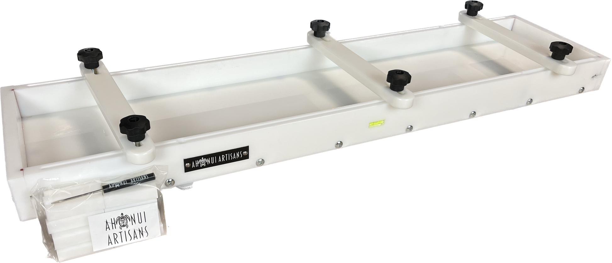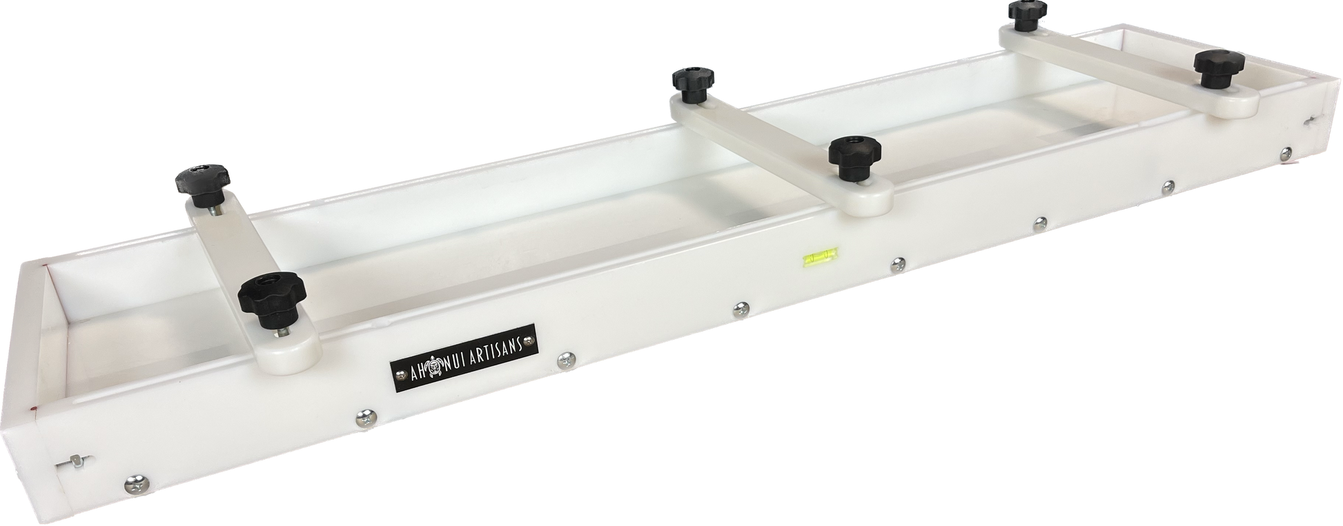 The leveling system consists of 4 integrated leveling feet and 2 bubble levels. The integrated leveling feet allow you to level your form from the top using a standard, flat head screw driver (or the included Ahonui Artisans screwdriver). The bubble levels help you visually adjust your form to be level, regardless of your workspace.