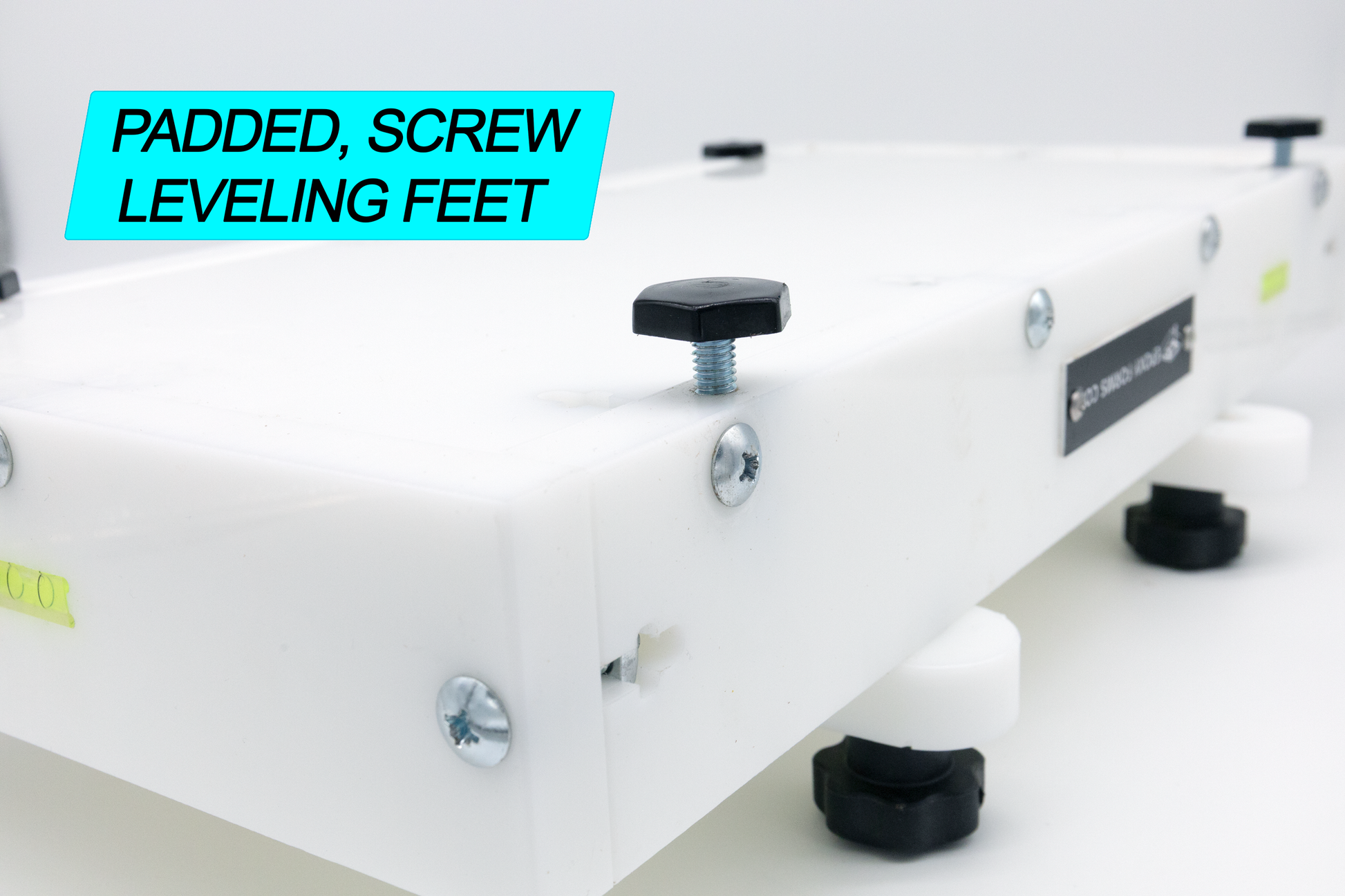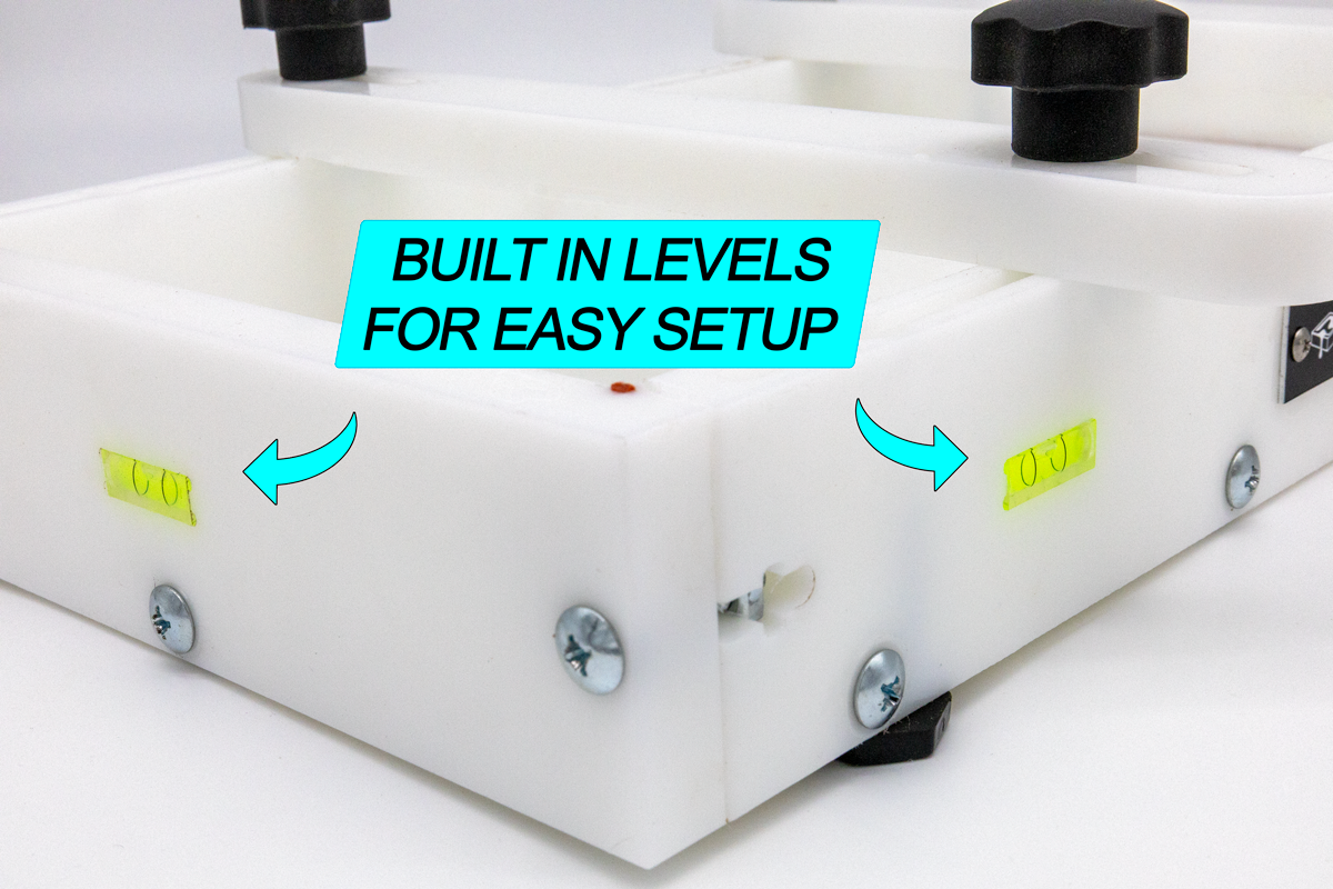 The leveling system consists of 4 integrated leveling feet and 2 bubble levels. The integrated leveling feet allow you to level your form from the top using a standard, flat head screw driver (or the included Ahonui Artisans screwdriver). The bubble levels help you visually adjust your form to be level, regardless of your workspace.