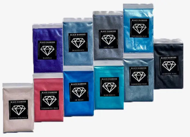 💎This Color Set includes (4)51g/1.8oz containers of pigment (Mahogany, Bora Bora Blue, Black Diamond and Emerald Green) and (1) Variety pack containing 10 different colors 5g each (Midnight Blue, Lux Blue, Caribbean Blue, FireBrick Red/Pink, Blissful Blue/Green,Blue Slate, Burple, Iridescent Blue, Cambridge Blue, Pure Blue/Green)