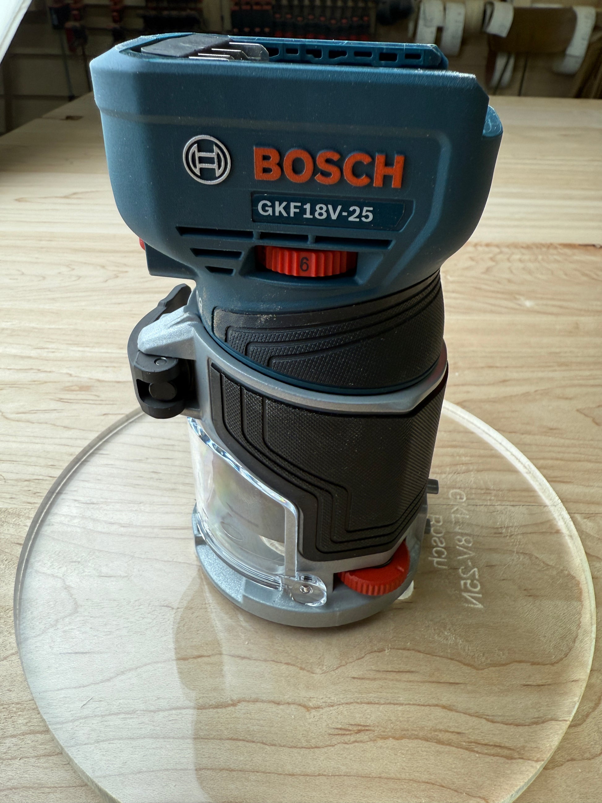 Is your factory router base not large enough? We have you covered. This is our 8 inch round router base that fits the Bosch Compact Trim Router also fits the plunge base. It's made out of 3/8" cast acrylic to be very durable! It has countersunk holes so that you can use the factory screws. It is compatible with PC-style router bushing sets.