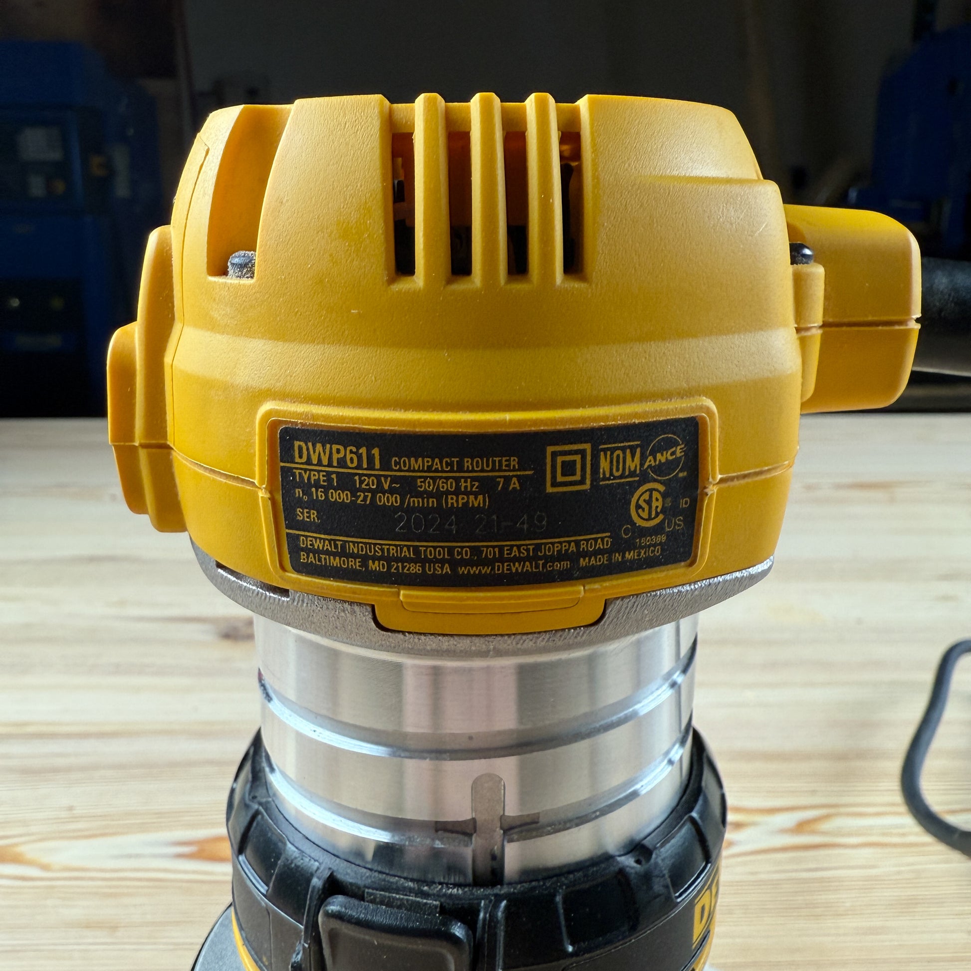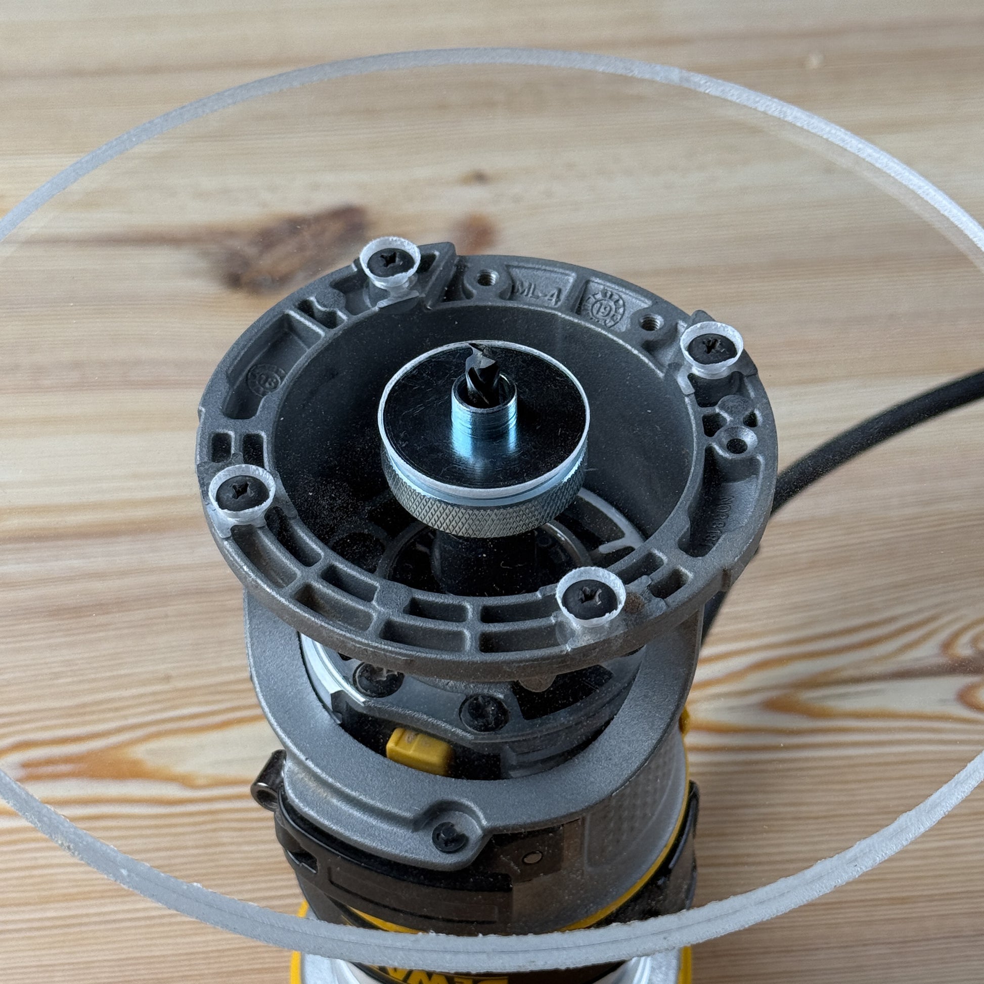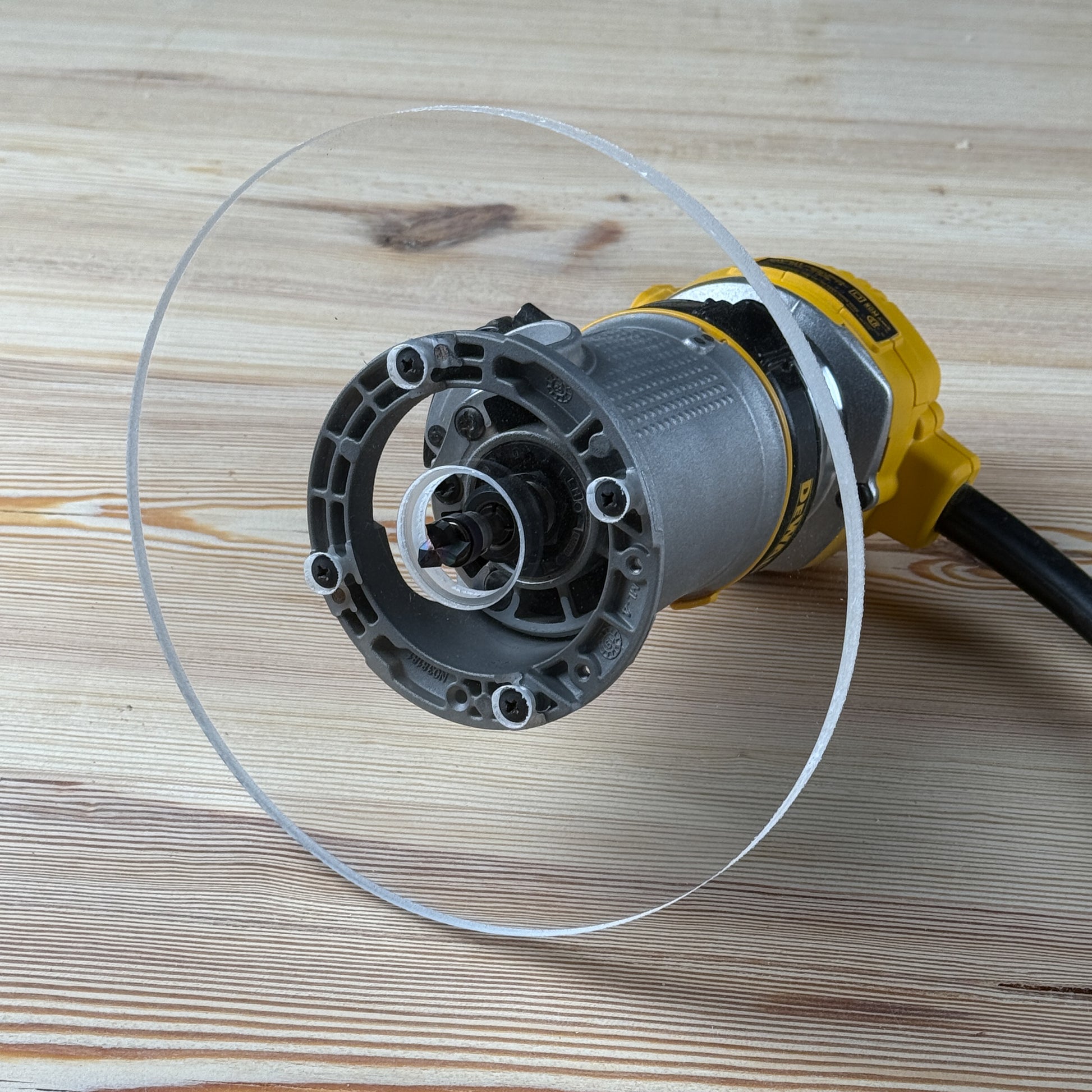 Is your factory router base not large enough? We have you covered. This is our 8 inch round router base that fits the Dewalt DWP611 or DCW600B. It's made out of 3/8" cast acrylic to be very durable! It has countersunk holes so that you can use the factory screws. It is compatible with PC-style router bushing sets.